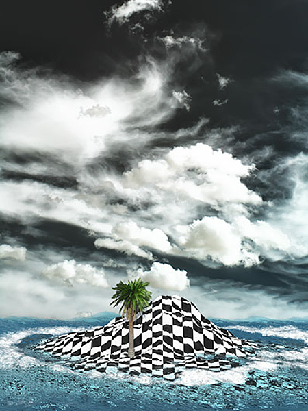 Eine Insel, deren Oberfläche aus dem von mir so beliebten Schachbrettmuster besteht, bildet einen interessanten Kontrast zum wolkenbehangenen Himmel. Wellengang und Brandung umgeben die kleine Insel mit Palme.