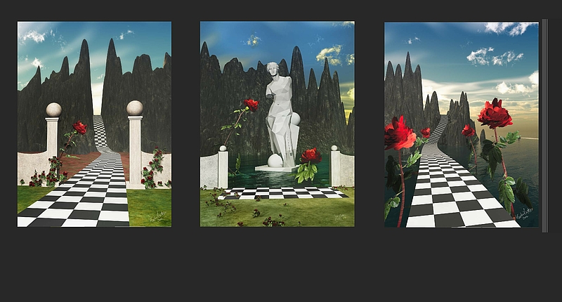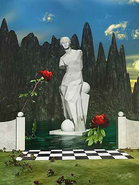 Der Bildtitel "Path of Life 3 - Venus" führt den Betrachter in eine faszinierende surreale Welt. Inmitten türkisfarbenen Wassers erhebt sich eine kubistisch abstrahierte Darstellung der Venus von Milo, die elegant an einer antiken Säule mit einer mysteriösen Kugel lehnt. Ihr Ausdruck ist rätselhaft und zeitlos, während eine üppige Rose in ihre Richtung wächst, als würde sie das Herz der Göttin ansprechen.